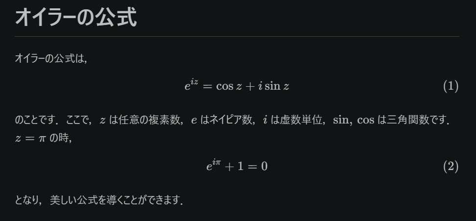 のことです.ここで,$z$ は任意の複素数,$e$ はネイピア数,$i$ は虚数単位,$\sin,\,\cos$ は三角関数です.$z=\pi$ の時,