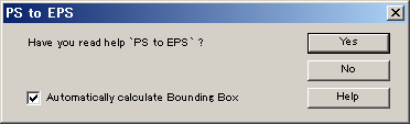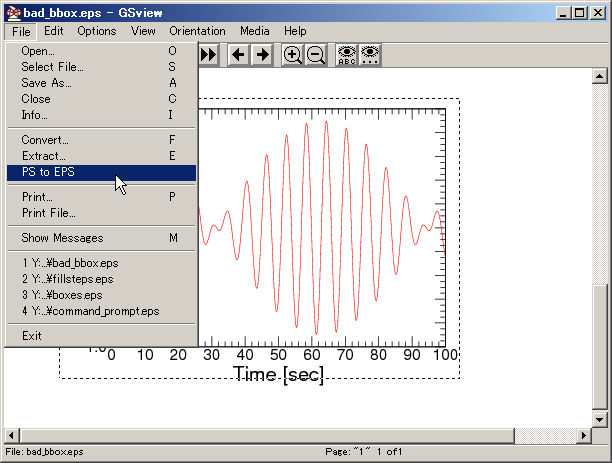 解決方法ここでは,GSviewとepstoolを使った修正方法を示します.GSviewはGUIで作業ができます.epstoolはCUIですが,Drag and Dropに対応したバッチファイルにすることもできます.さらに,gnuplotから呼び出して自動で修正させることも可能です.お勧めは,ここの最後で示す「gnuplotにコマンドを埋め込む(Windows, Linux)」方法です. GSviewを使う(Windows)GSviewを使うとGUI で BoundingBox の修正ができます.おそらく,これが最も手軽な方法です. 修正するファイルが多くなると,面倒になります. 修正するEPSファイルを開き,メインメニューの「File」から,「PS to EPS」を選択します.すると,ダイアログ「PS to EPS」が現れますので,「Automatically calculate Bounding Box」をチェックし,ボタン[Yes]をクリックします.最後に,保存用のダイアログが現れますので,適当な名前をつけて保存を行います. 以上で,BoundingBoxの修正ができます. epstoolをつかう(Windows)インストールまずは,インストールです.インターネットの適当なところ,たとえばここから「epstool-3.08-win32.zip」をダウンロードします.ファイルはzipで固めて圧縮されていますので,適当なソフトウェーで解凍します.すると,フォルダー「epstool-3.08」ができあがりますので,それを「C:\Program Files」あるいは「C:\Program Files (X86)」(64ビットOSの場合)にフォルダーごと入れます.すると,実行ファイルは「epstool-3.08\bin」にありますので,パスを通します. コマンドプロンプトで「epstool --vesion」とタイプすると,「epstool 3.08 2005-06-06」と表示されれば,インストールとはOKです. 使用方法は,解凍してできたフォルダーの中のマニュアル「epstool-3.08\doc\epstool.htm」に書かれています. コマンドコマンドプロンプトからコマンド操作により,BoundingBoxの修正は以下のようにします.BoundinBoxが間違っているファイル(bad_bbox.eps)が修正され,新規にファイル(fix_bbox.eps)ができあがります.