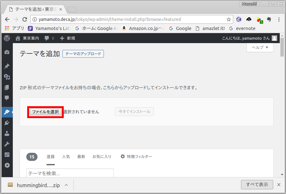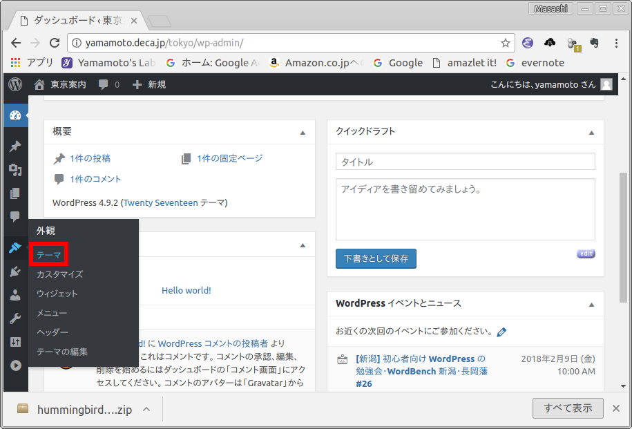 ダウンロードしたテーマ「hummingbird.zip」を解凍する必要はありません.次節で示すように zip ファイルのままで,WordPres にインストールできます.