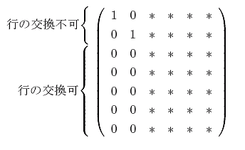 このようなわけで、元の行列の行を入れ替えた場合、その逆行列は元の行列の逆行列の列 を入れ替えたものになる。従って、ピボット選択により係数行列の行を入れ替えると、逆 行列の列を入れ替える必要が生じる。実際にプログラムでは、以下のようにする。