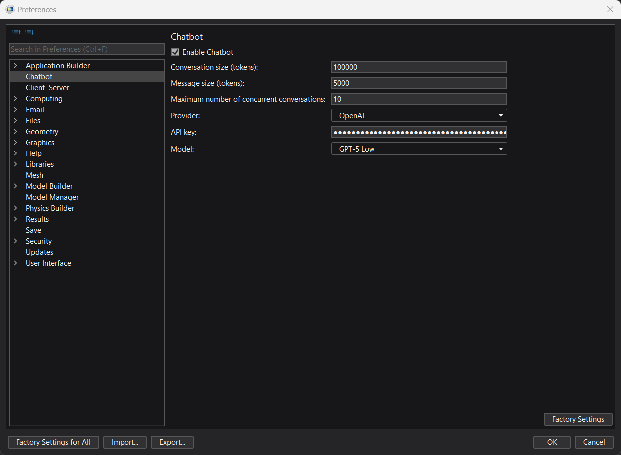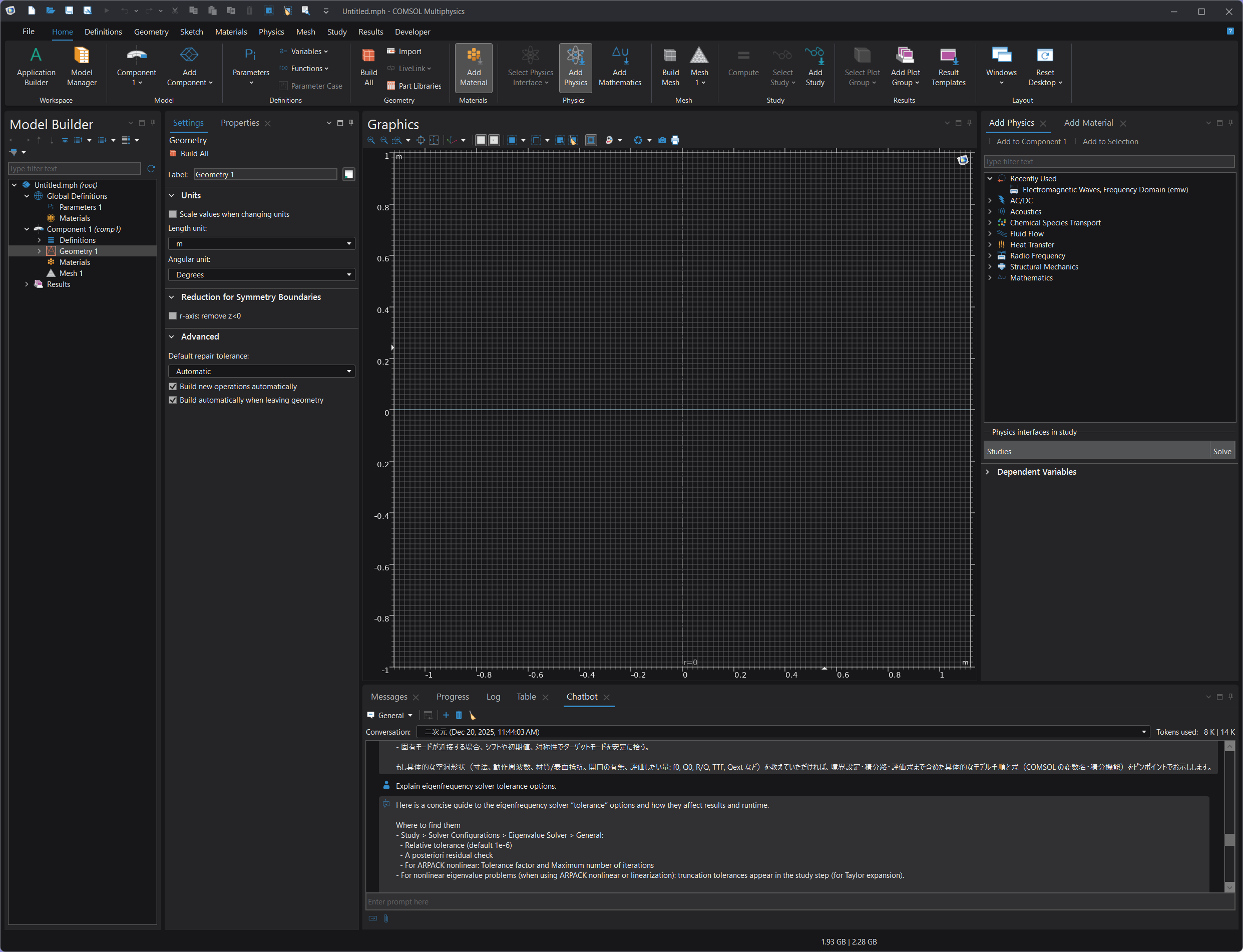 COMSOL を再起動後に Chatbot が使用可能になります.Chatbot を使うためには,Home > Layout > Windows > Chatbot をクリックすると,Chatbot の画面が表示されます.「Enter prompt here」に質問を記述すると,回答が得られます(使用例).